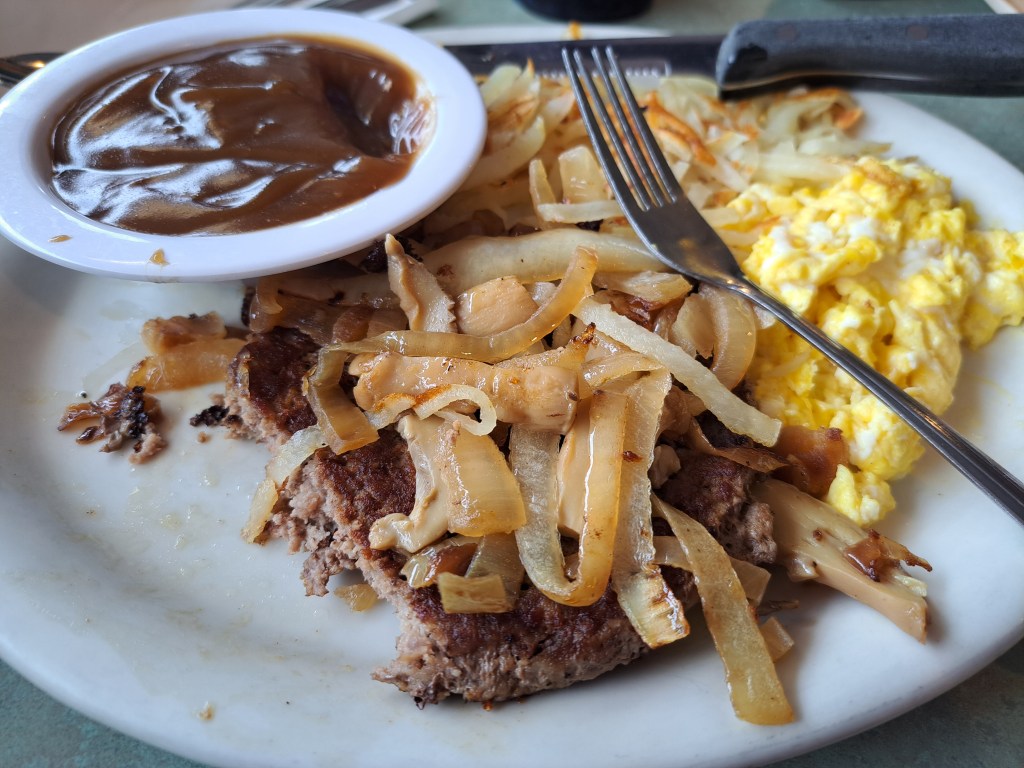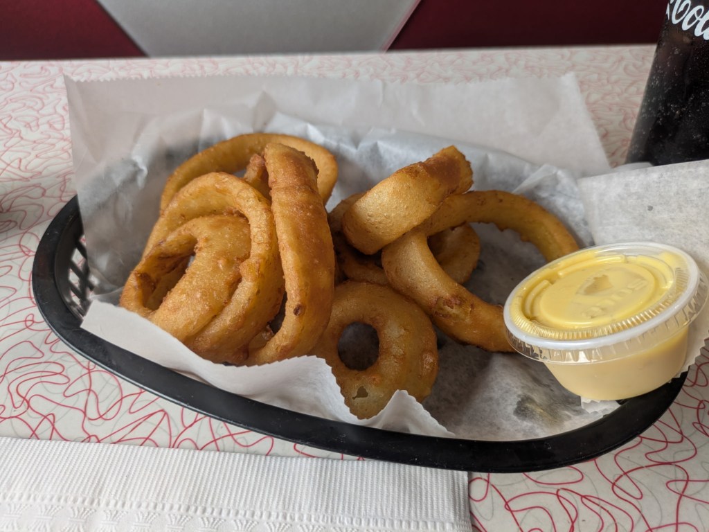 Mr. Reuben: Pretty good. Not the best we’ve ever had, but good nonetheless. The sauerkraut was okay, and the corned beef was fresh. The fries that came with it were average.Nearly Famous O’Rings: Good, battered. (There’s only so much we can say about this one, right?)Country Fried Steak: Didn’t expect to receive a schnitzel instead of a steak. Considering that yours truly does not like pork, that was bad. We can’t judge the breakfast gravy on top of it because neither of us likes it, doesn’t matter where it’s from. Eggs and toast were fine, and the home fries were pretty decent.